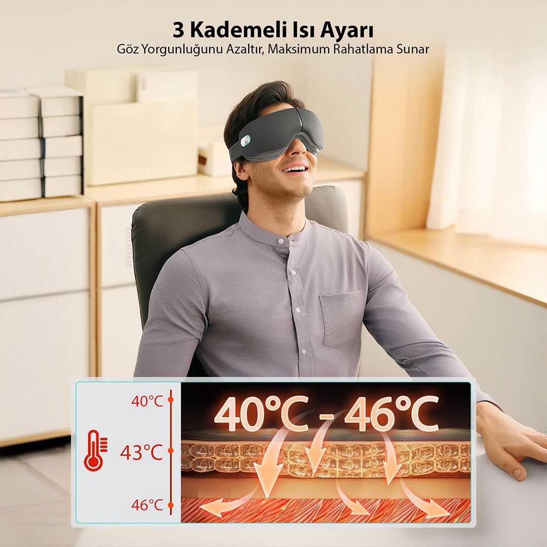 Isı terapisi ve farklı masaj modlarıyla göz çevresini rahatlatır ve gevşetir.