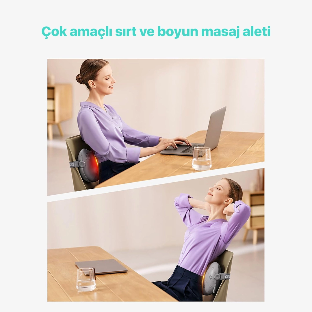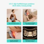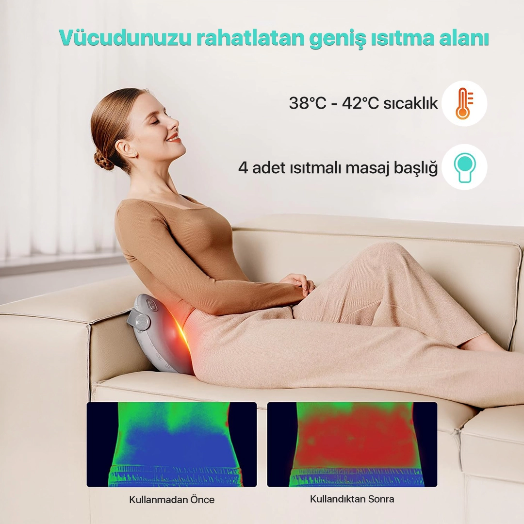 Masaj yastığı, 100.4°F – 107.6°F (38°C – 42°C) sıcaklık aralığında ısı terapisi sunarak kasları gevşetir ve rahatlama sağlar.